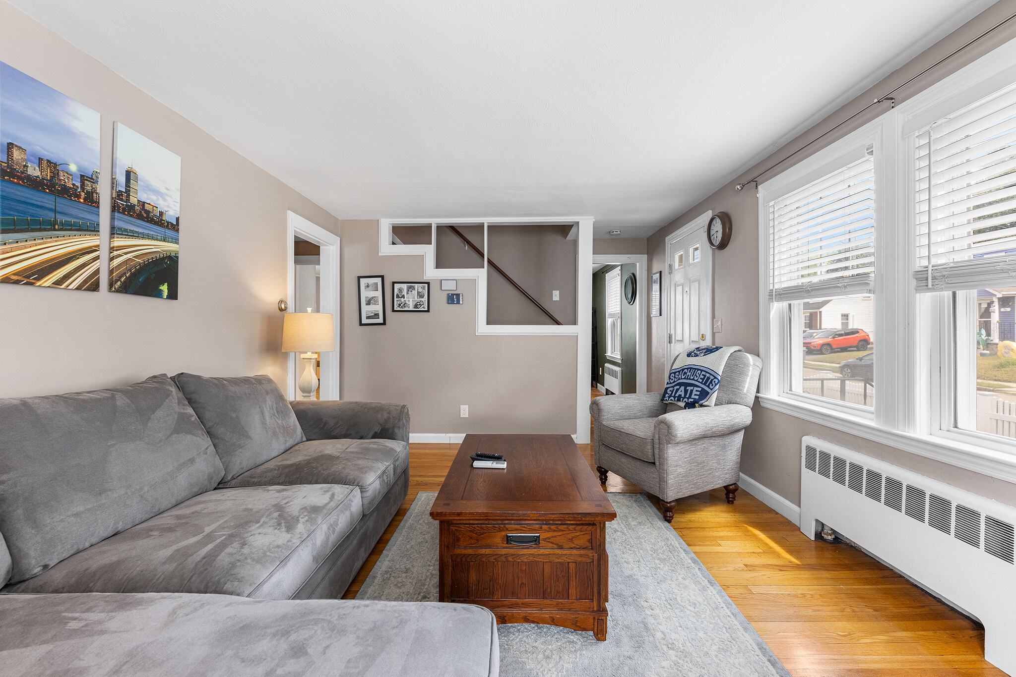 The stairwell cuts this level into two, and on the left is the larger side, the 179-square-foot living room. This space highlights a second key feature of this home; the flooring is hardwood original to the home. This is found throughout the first level, except for the kitchen, the mud room, and the home’s one full bath. The living room is sunny due to a pair of double-hung windows on the front exterior wall and a third double-hung window on the left exterior wall. A door in the right rear opens to a short hallway and the remainder of the home.