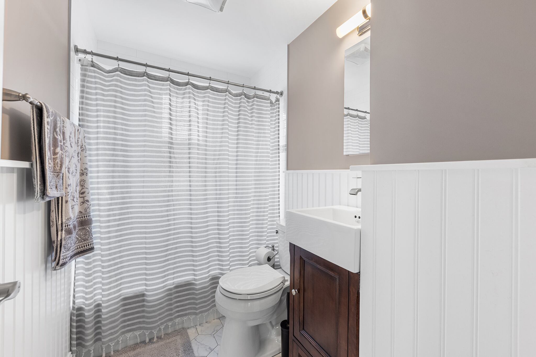 The 43-square-foot bathroom is on the right and features a single wooden vanity with white sink, hexagonal tile flooring, and half-wall Nantucket beadboard on the walls. There is a shower/bath combination featuring subway tile backsplash with a mosaic accent tile strip.
