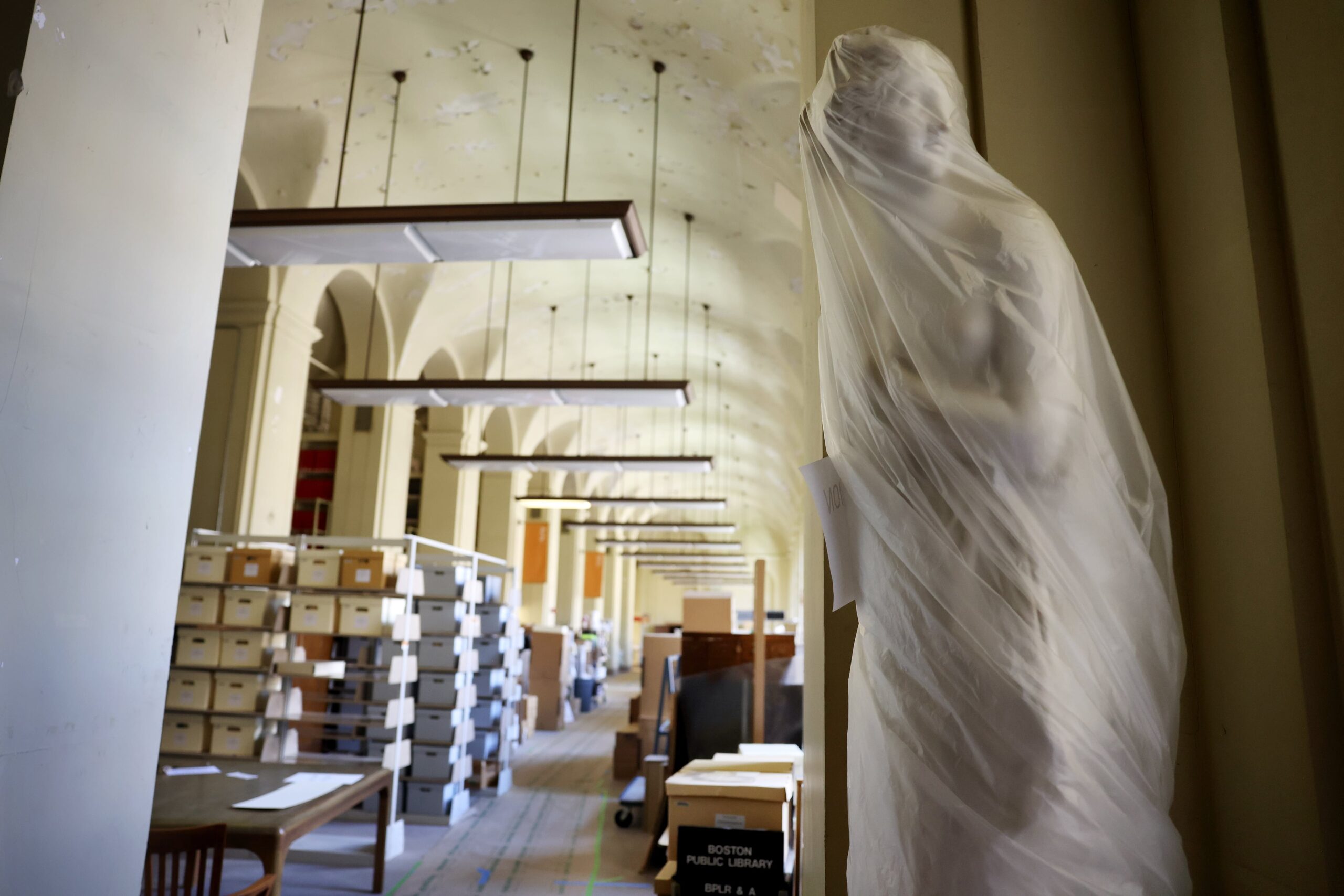 There are neoclassical sculptures that peek from beneath plastic, a weathervane in the shape of a cod, a printing press that belonged to artist Hyman Bloom, and a set of golf clubs once swung by author Cleveland Amory. And that’s to say nothing of the myriad architectural plans, microfiche, administrative records, card catalogues, and archives piled about in boxes and in crates.