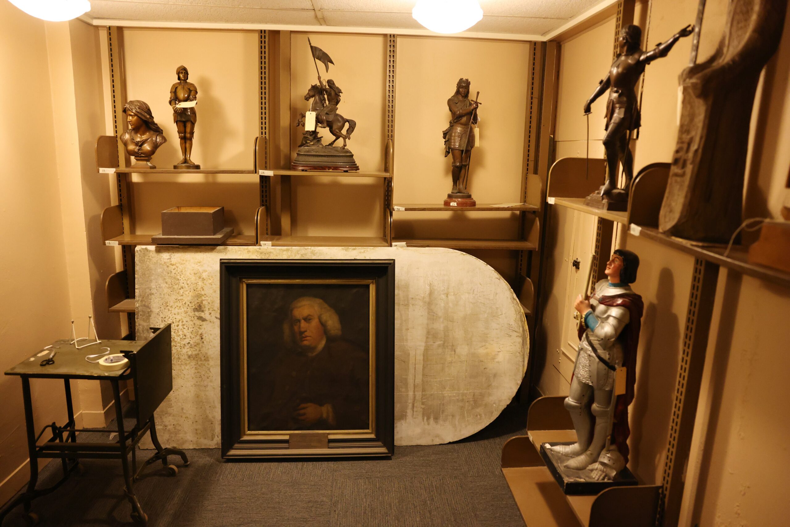 The rooms, which rival many of the building’s most celebrated spaces, now warehouse a Narnia-worthy collection of the library’s holdings — everything from sculptures of Joan of Arc and a portrait of Samuel Johnson, to a room of illuminated dioramas, where a pair of miniature boxers stand frozen in mid-fight, as though before a roaring crowd.