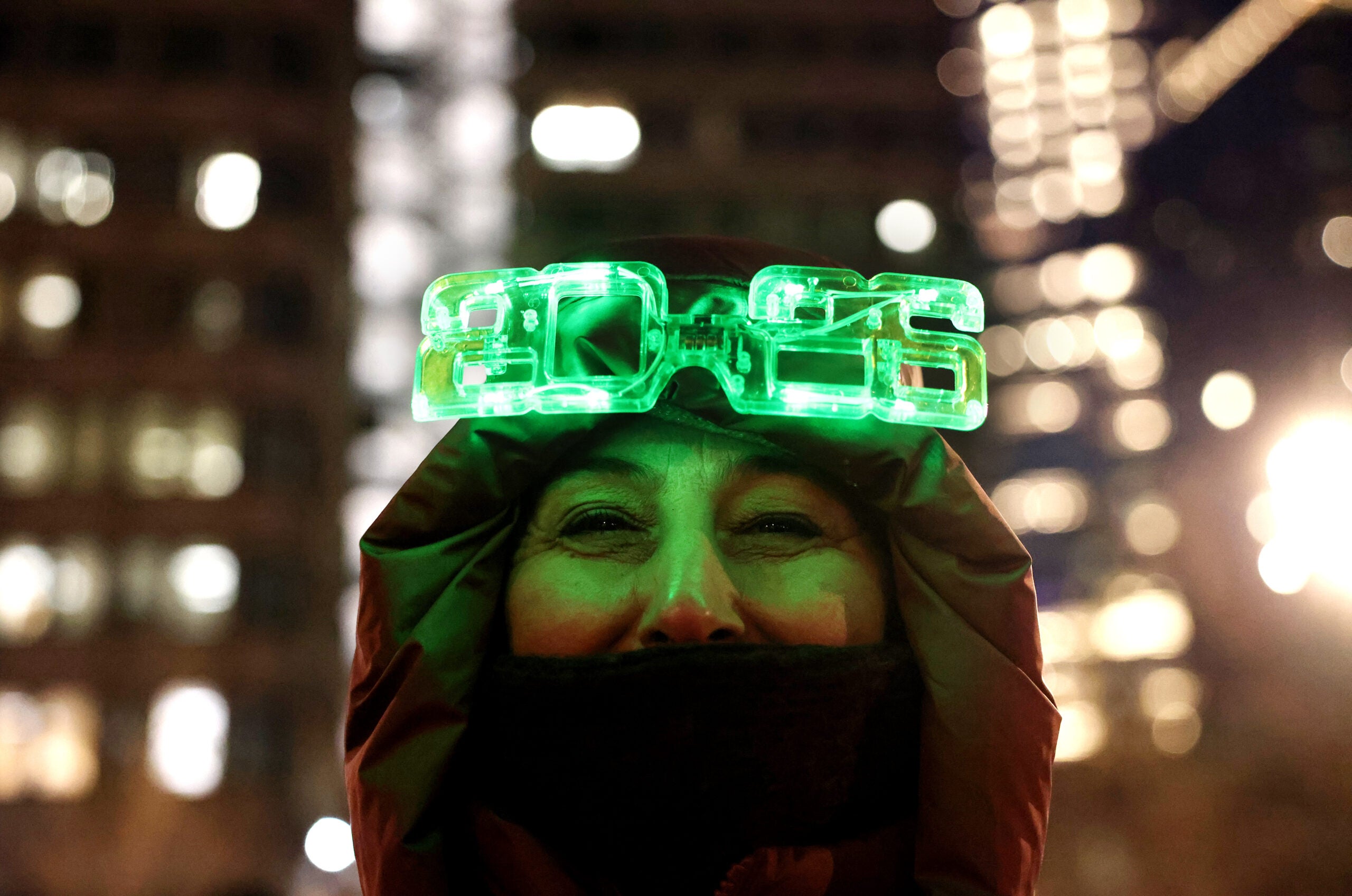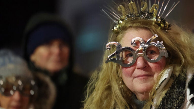 A woman wore 2026 glasses as she watched the First Night parade in Boston, Massachusetts December 31, 2025. (Jessica Rinaldi/Globe Staff)