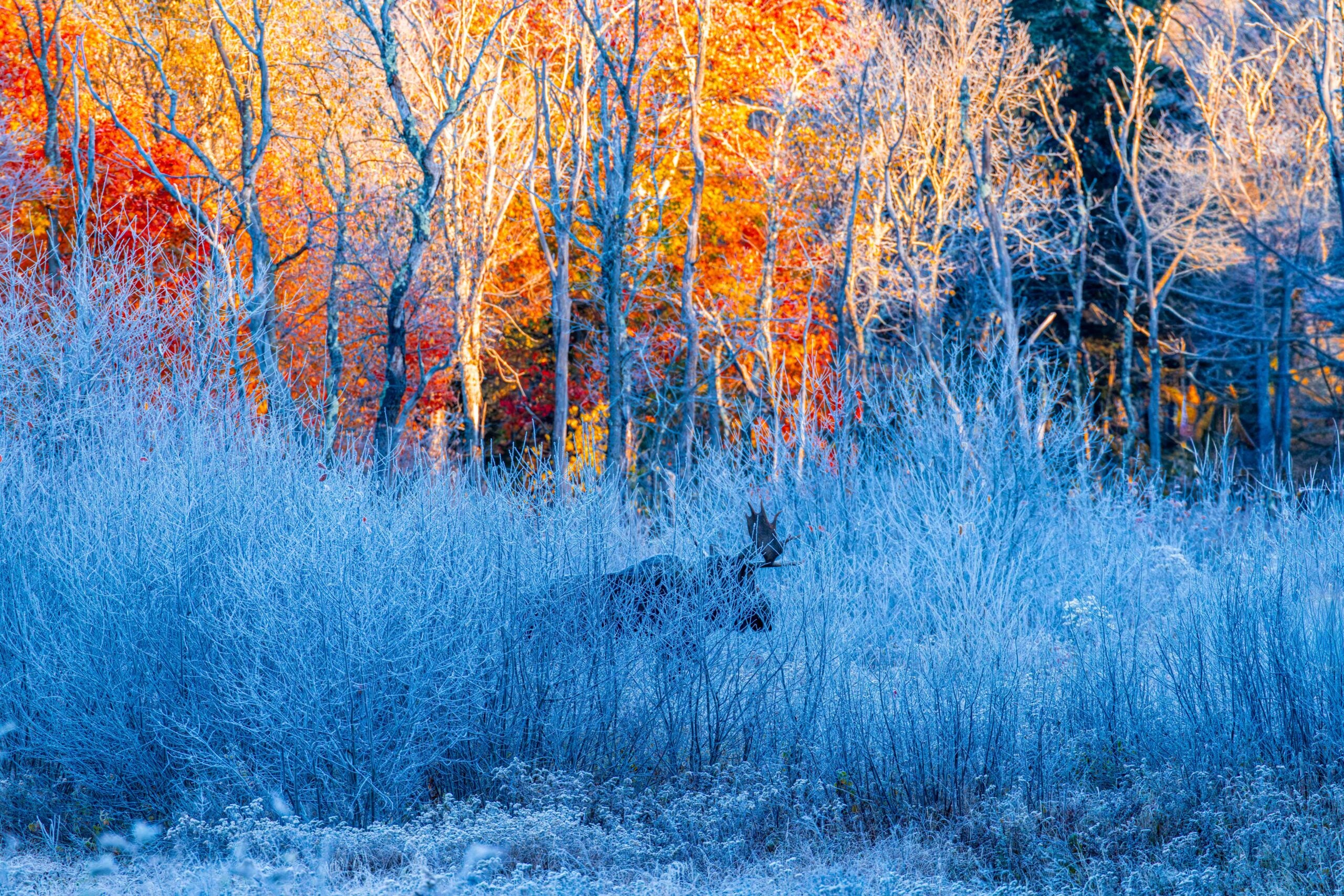 I’ll leave you with this photo of the side of the Kancamagus Highway by Britta M., where you can see frost on the early morning grass and the sun illuminating the fall colors in the background.