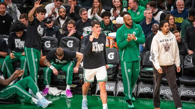Celtics bench celebrates Finn Gomez for the Boston Globe