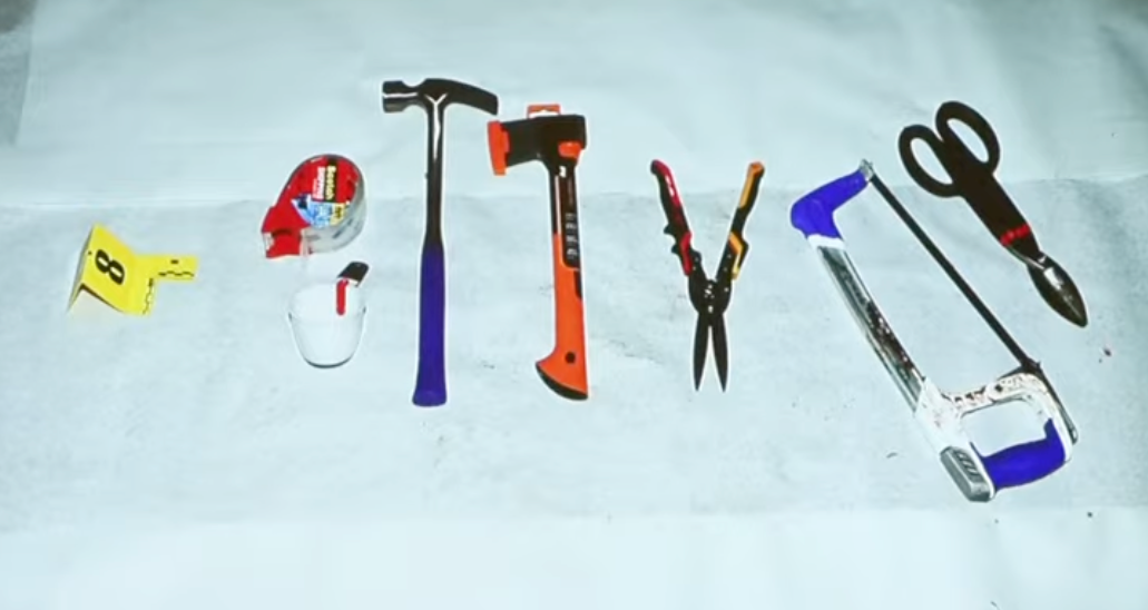 Photos shown to jurors revealed a trail of items stained with what appeared to be blood — a splattered carpet, men’s outdoor slippers soaked through, a bottle of hydrogen peroxide, a Tyvek suit, and an array of tools, including a hammer, wire snips, a hatchet, and a hacksaw streaked with red-brown stains.