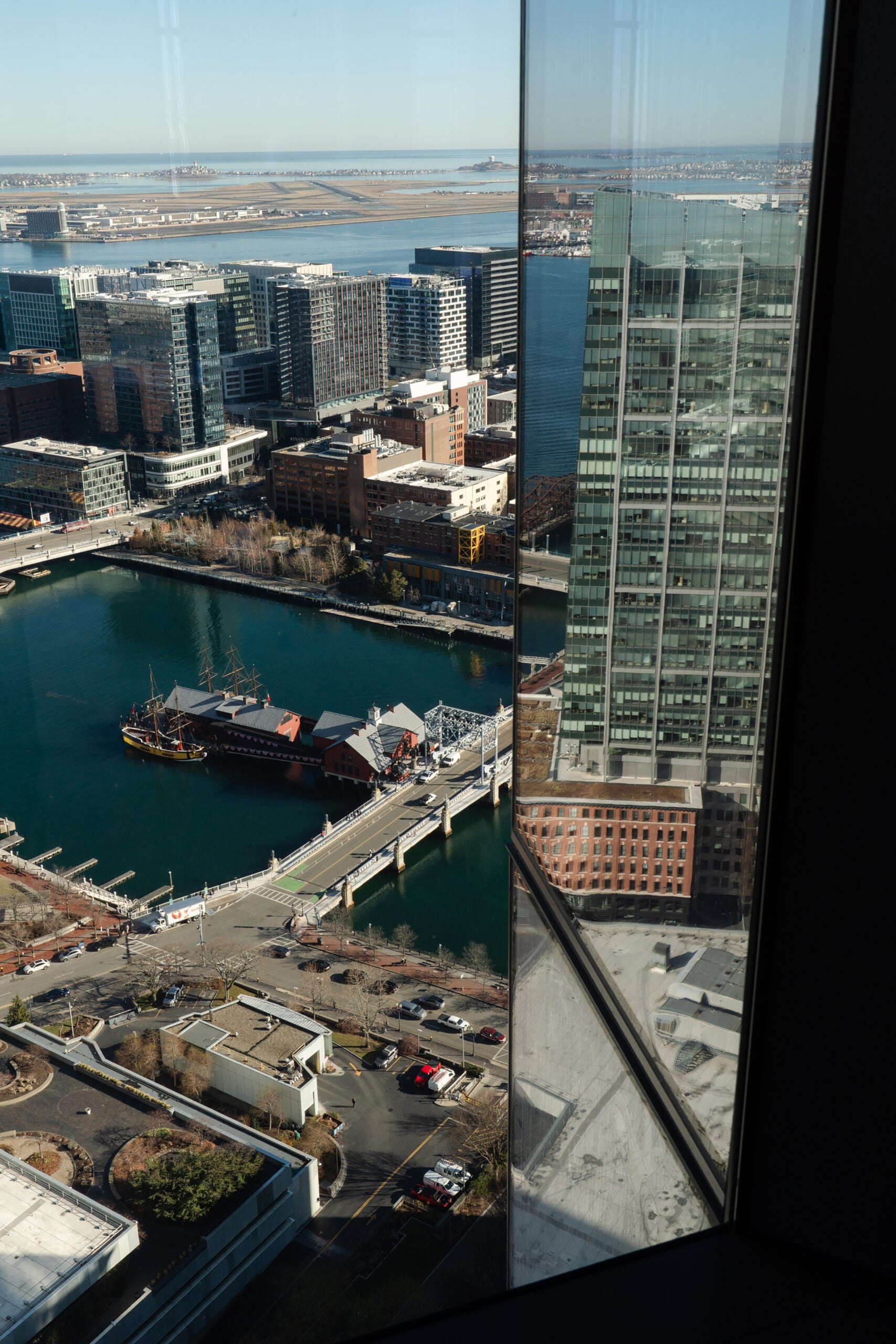 Amenities include a spa, gym, library and a heated outdoor pool on the 36th floor, plus three restaurants for office tenants and residents on lower floors. Views from the higher floors include the Boston Tea Party Ships & Museum, the Massachusetts State House and the Seaport District. Some residents can watch planes taking off from Logan Airport from their windows.