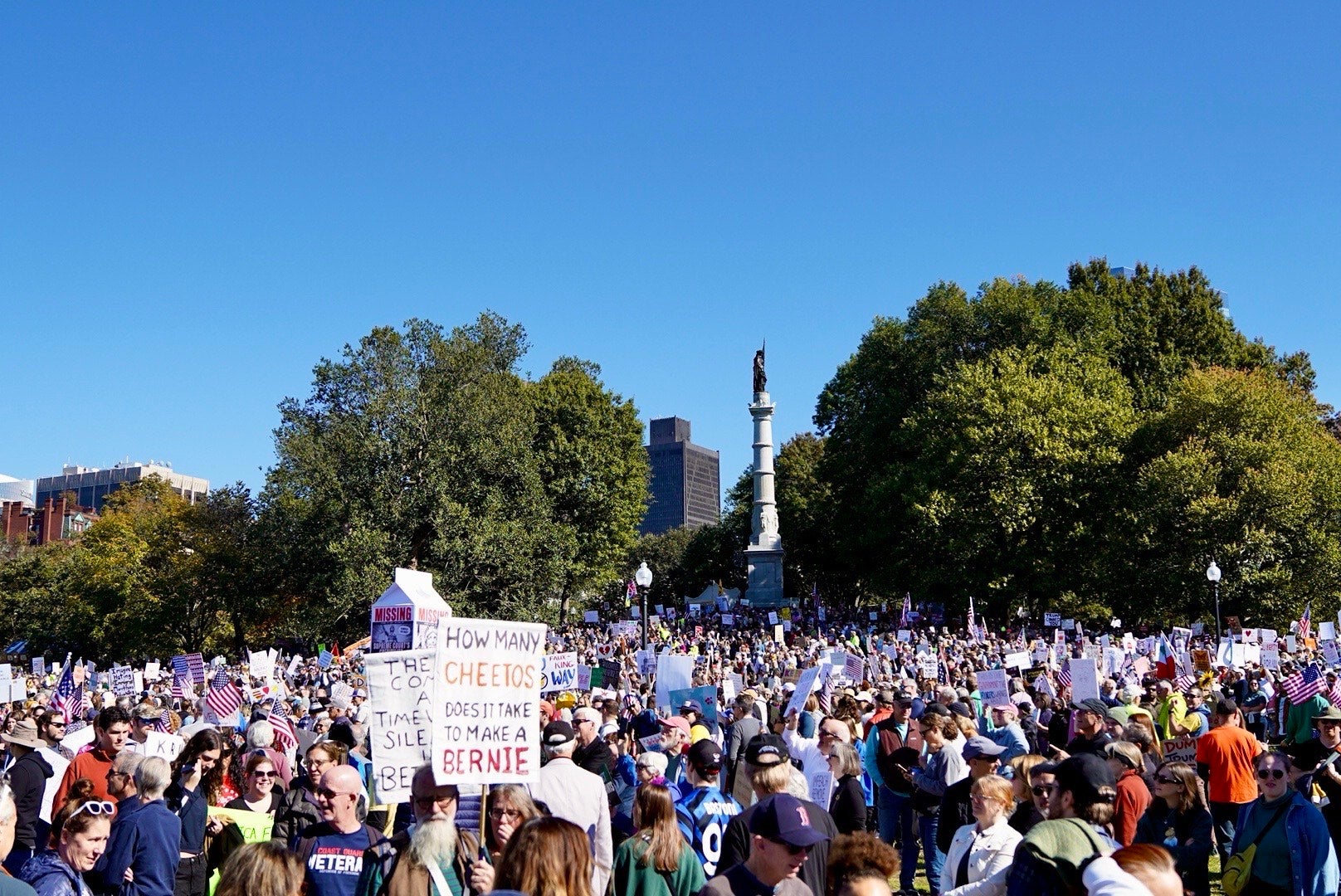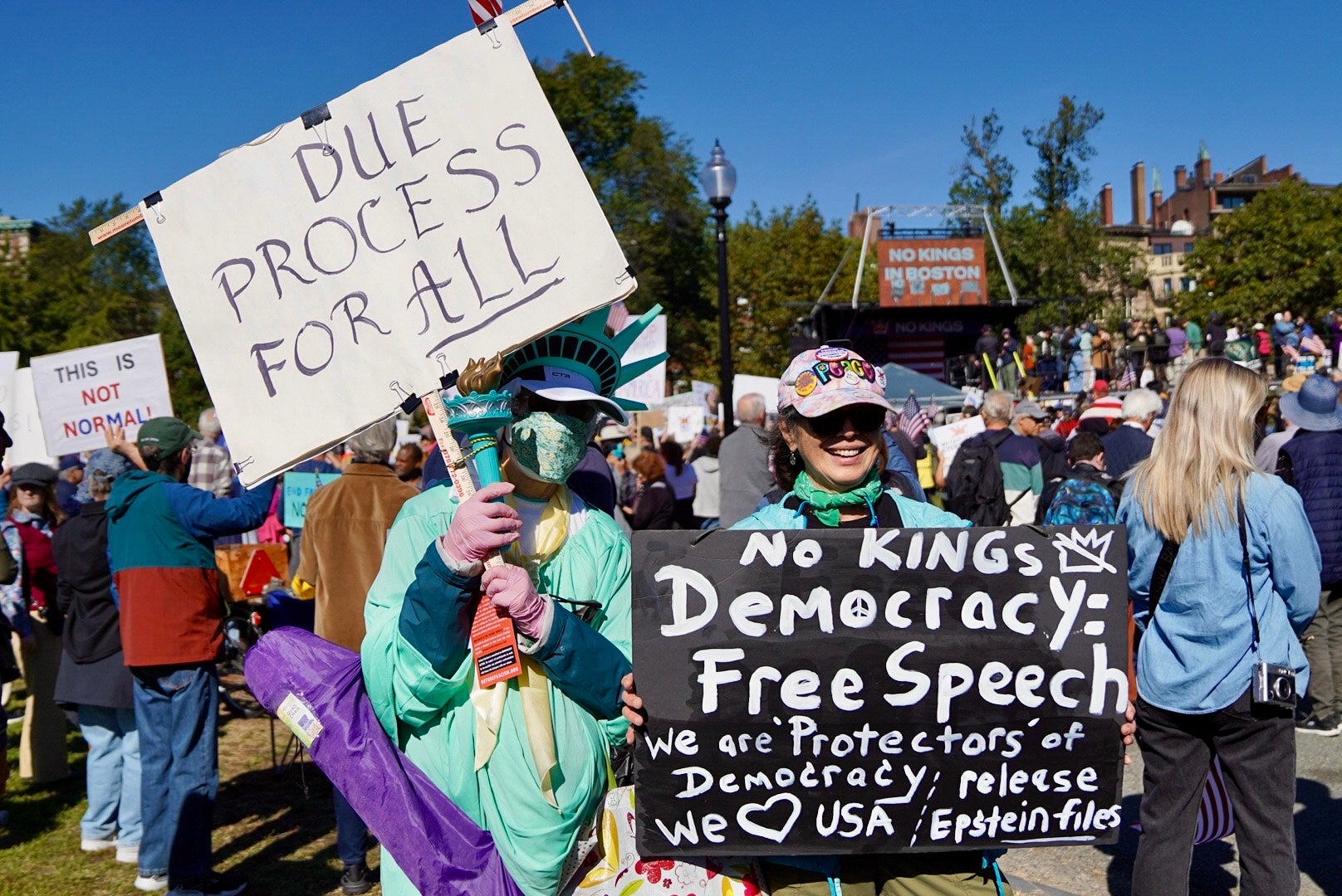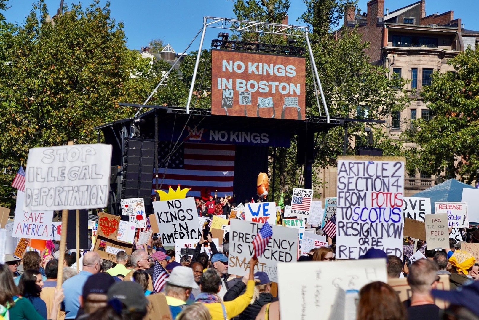 Protesters clap and hold signs at the “No Kings” rally on Boston Common. – Kelly Chan/Boston.comTwo protestors walk around Boston Common holding up the American flag at the “No Kings” rally. – Kelly Chan/Boston.comA man holds up a t-shirt for sale that says, “Sorry about our president,” in 14 different languages. – Kelly Chan/Boston.comProtestors held signs at Saturday’s “No Kings” rally in Boston. – Kelly Chan/Boston.comSome protestors played music at Saturday’s “No Kings” demonstration in Boston. – Kelly Chan/Boston.comProtestors held signs at Saturday’s “No Kings” rally in Boston. – Kelly Chan/Boston.comA group of people sign petitions at a table in the Boston Common for increasing voter accessibility, limiting bonuses for politicians, and making spending records public. – Kelly Chan/Boston.comSome protestors played music at Saturday’s “No Kings” demonstration in Boston. – Kelly Chan/Boston.comProtestors hold signs at the “No Kings” protest at Boston Common. – Kelly Chan/Boston.comProtestors hold signs at the “No Kings” protest at Boston Common. – Kelly Chan/Boston.comProtestors hold signs at the “No Kings” protest at Boston Common. – Kelly Chan/Boston.comProtestors made signs for Saturday’s “No Kings” rally in Boston. – Kelly Chan/Boston.comProtestors hold signs at the “No Kings” protest at Boston Common. – Kelly Chan/Boston.comProtestors held signs at Saturday’s “No Kings” rally in Boston. – Kelly Chan/Boston.comProtestors hold signs at the “No Kings” protest at Boston Common. – Kelly Chan/Boston.comProtestors hold signs at the “No Kings” protest at Boston Common. – Kelly Chan/Boston.comProtestors hold signs at the “No Kings” protest at Boston Common. – Kelly Chan/Boston.comProtestors hold signs at the “No Kings” protest at Boston Common. – Kelly Chan/Boston.comProtestors hold signs at the “No Kings” protest at Boston Common. – Kelly Chan/Boston.comDemonstrator Richard Saunders shows off his garb for the day prior to the No Kings rally on Boston Common. – (Craig F. Walker/Globe Staff)Members of Elite Security prepare for the No Kings rally on Boston Common. – (Craig F. Walker/Globe Staff)Crew members set up the stage for the No Kings rally on Boston Common. – (Craig F. Walker/Globe Staff)Protesters gather before the No Kings protest at the common in Quincy. – ( Matthew J. Lee/Globe Staff)A protester dressed as a jester as she arrives at the “No Kings” rally on Boston Common. – (Craig F. Walker/Globe Staff)The crowd at the No Kings rally on Boston Common. – (Craig F. Walker/ Globe Staff)Protesters gather before the No Kings rally at the Boston Common. – (Craig F. Walker/Globe Staff)Protesters gather before the No Kings protest at the common in Quincy. – ( Matthew J. Lee/Globe Staff)A trio dressed as lobsters were protesting, “shellfish kings” at the No Kings rally on Boston Common. – (Craig F. Walker/Globe Staff)Protesters arrive at the Boston Common for the “No Kings” rally. – (Craig F. Walker/Globe Staff)