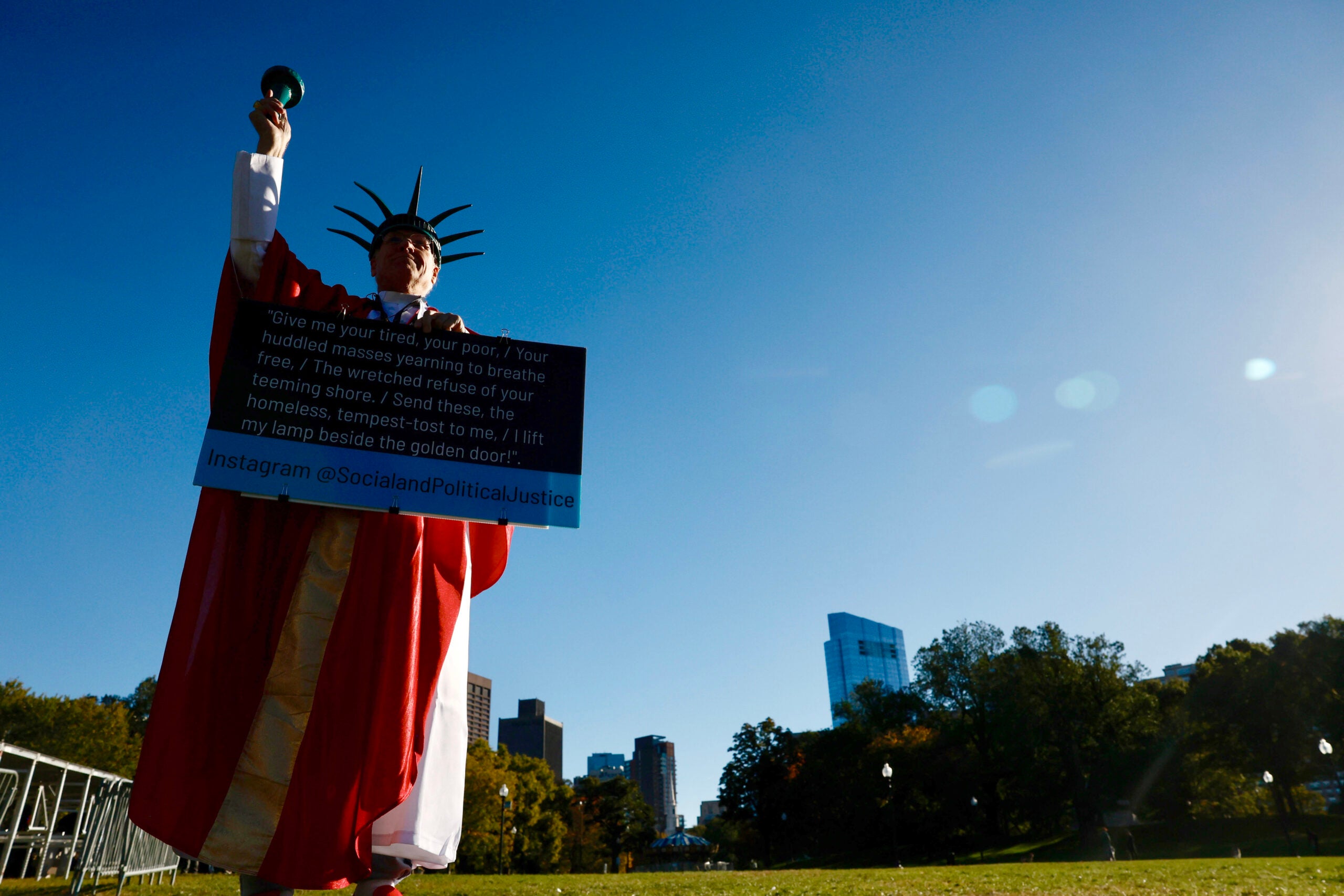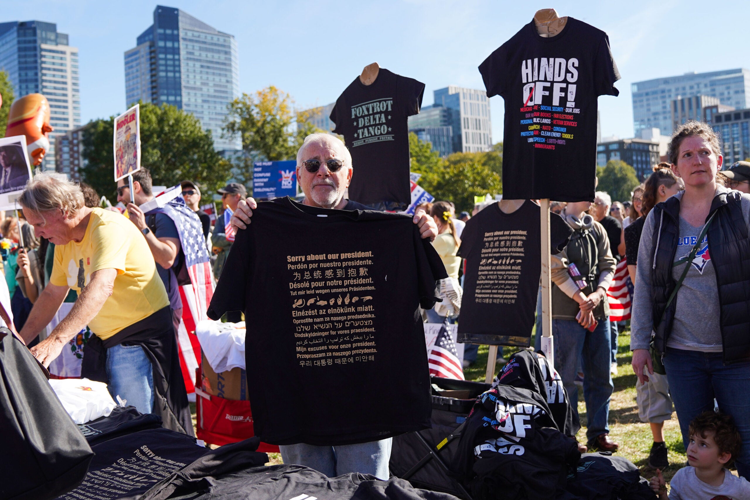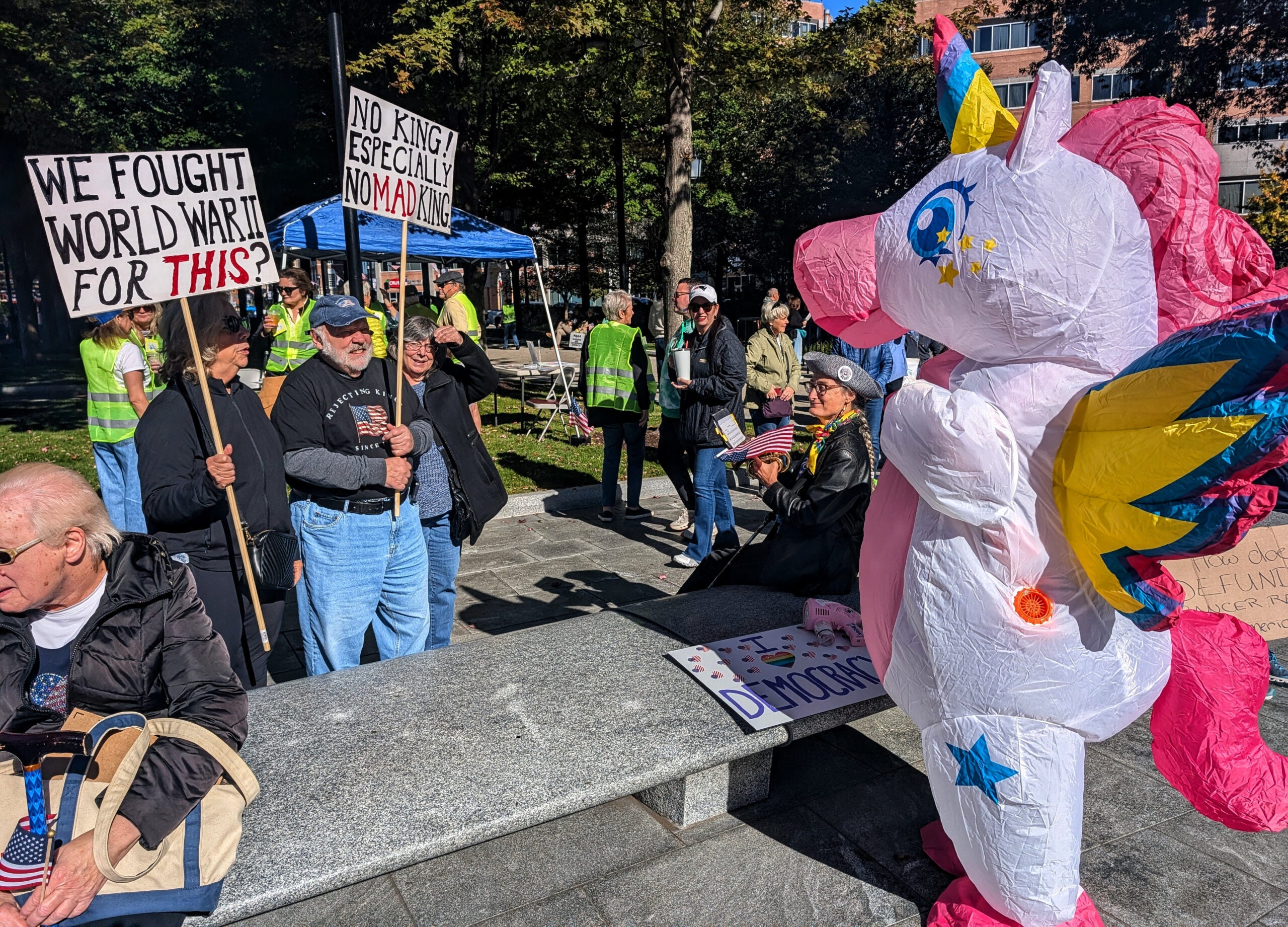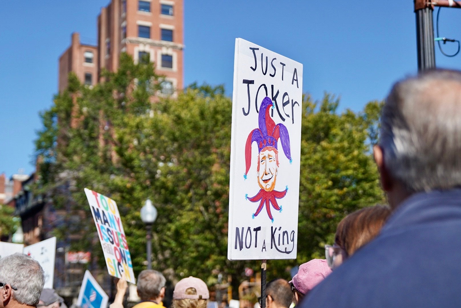 Protesters clap and hold signs at the “No Kings” rally on Boston Common. – Kelly Chan/Boston.comTwo protestors walk around Boston Common holding up the American flag at the “No Kings” rally. – Kelly Chan/Boston.comA man holds up a t-shirt for sale that says, “Sorry about our president,” in 14 different languages. – Kelly Chan/Boston.comProtestors held signs at Saturday’s “No Kings” rally in Boston. – Kelly Chan/Boston.comSome protestors played music at Saturday’s “No Kings” demonstration in Boston. – Kelly Chan/Boston.comProtestors held signs at Saturday’s “No Kings” rally in Boston. – Kelly Chan/Boston.comA group of people sign petitions at a table in the Boston Common for increasing voter accessibility, limiting bonuses for politicians, and making spending records public. – Kelly Chan/Boston.comSome protestors played music at Saturday’s “No Kings” demonstration in Boston. – Kelly Chan/Boston.comProtestors hold signs at the “No Kings” protest at Boston Common. – Kelly Chan/Boston.comProtestors hold signs at the “No Kings” protest at Boston Common. – Kelly Chan/Boston.comProtestors hold signs at the “No Kings” protest at Boston Common. – Kelly Chan/Boston.comProtestors made signs for Saturday’s “No Kings” rally in Boston. – Kelly Chan/Boston.comProtestors hold signs at the “No Kings” protest at Boston Common. – Kelly Chan/Boston.comProtestors held signs at Saturday’s “No Kings” rally in Boston. – Kelly Chan/Boston.comProtestors hold signs at the “No Kings” protest at Boston Common. – Kelly Chan/Boston.comProtestors hold signs at the “No Kings” protest at Boston Common. – Kelly Chan/Boston.comProtestors hold signs at the “No Kings” protest at Boston Common. – Kelly Chan/Boston.comProtestors hold signs at the “No Kings” protest at Boston Common. – Kelly Chan/Boston.comProtestors hold signs at the “No Kings” protest at Boston Common. – Kelly Chan/Boston.comDemonstrator Richard Saunders shows off his garb for the day prior to the No Kings rally on Boston Common. – (Craig F. Walker/Globe Staff)Members of Elite Security prepare for the No Kings rally on Boston Common. – (Craig F. Walker/Globe Staff)Crew members set up the stage for the No Kings rally on Boston Common. – (Craig F. Walker/Globe Staff)Protesters gather before the No Kings protest at the common in Quincy. – ( Matthew J. Lee/Globe Staff)A protester dressed as a jester as she arrives at the “No Kings” rally on Boston Common. – (Craig F. Walker/Globe Staff)The crowd at the No Kings rally on Boston Common. – (Craig F. Walker/ Globe Staff)Protesters gather before the No Kings rally at the Boston Common. – (Craig F. Walker/Globe Staff)Protesters gather before the No Kings protest at the common in Quincy. – ( Matthew J. Lee/Globe Staff)A trio dressed as lobsters were protesting, “shellfish kings” at the No Kings rally on Boston Common. – (Craig F. Walker/Globe Staff)Protesters arrive at the Boston Common for the “No Kings” rally. – (Craig F. Walker/Globe Staff)