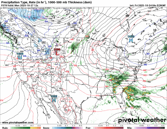 The Euro model shows a coastal storm forming early next week off the coast of the Carolinas, reaching New England by late Wednesday/early Thursday. – Pivotal Weather