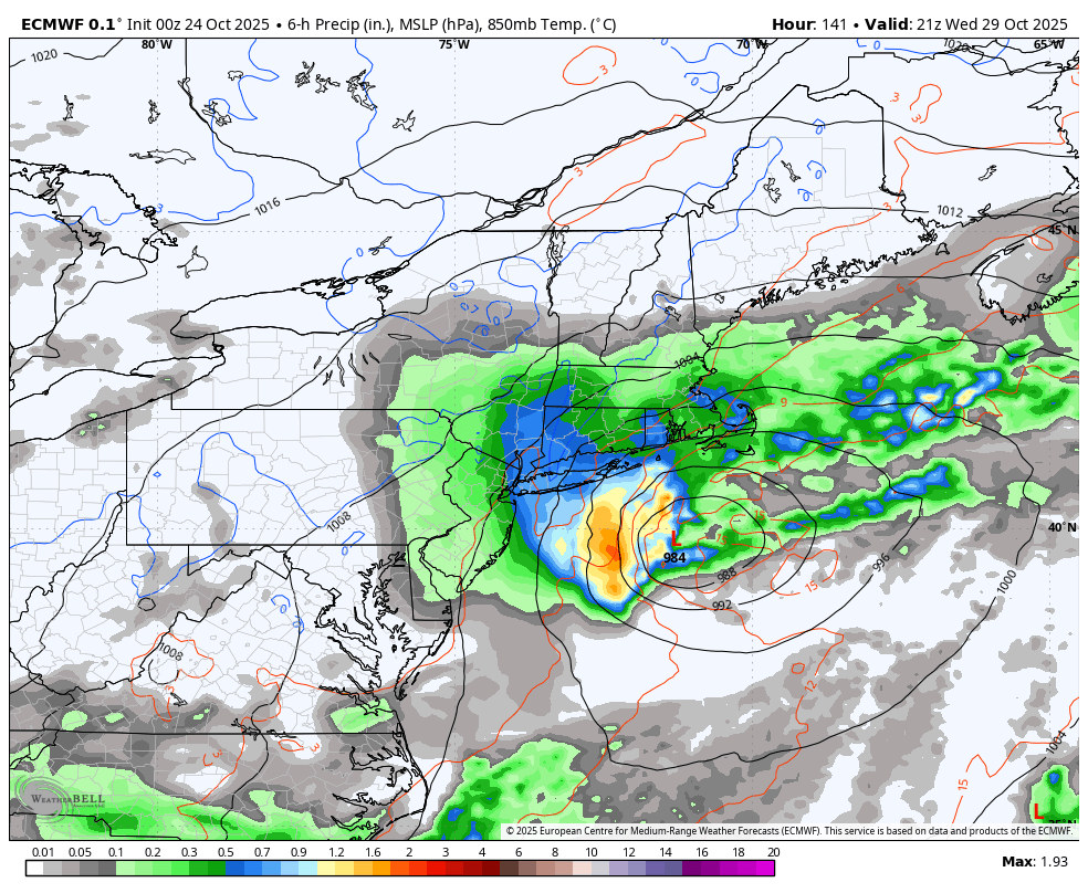 The Euro model has the nor’easter forming closer to the Carolina coast late Monday through Tuesday, and accelerating rather quickly up the coast toward New England. Showers could enter the picture as early as Wednesday afternoon, with the bulk of the storm arriving on Thursday. This scenario would keep Halloween trick-or-treating and any parties mostly in good shape, with perhaps only a few lingering scattered showers getting in the way.