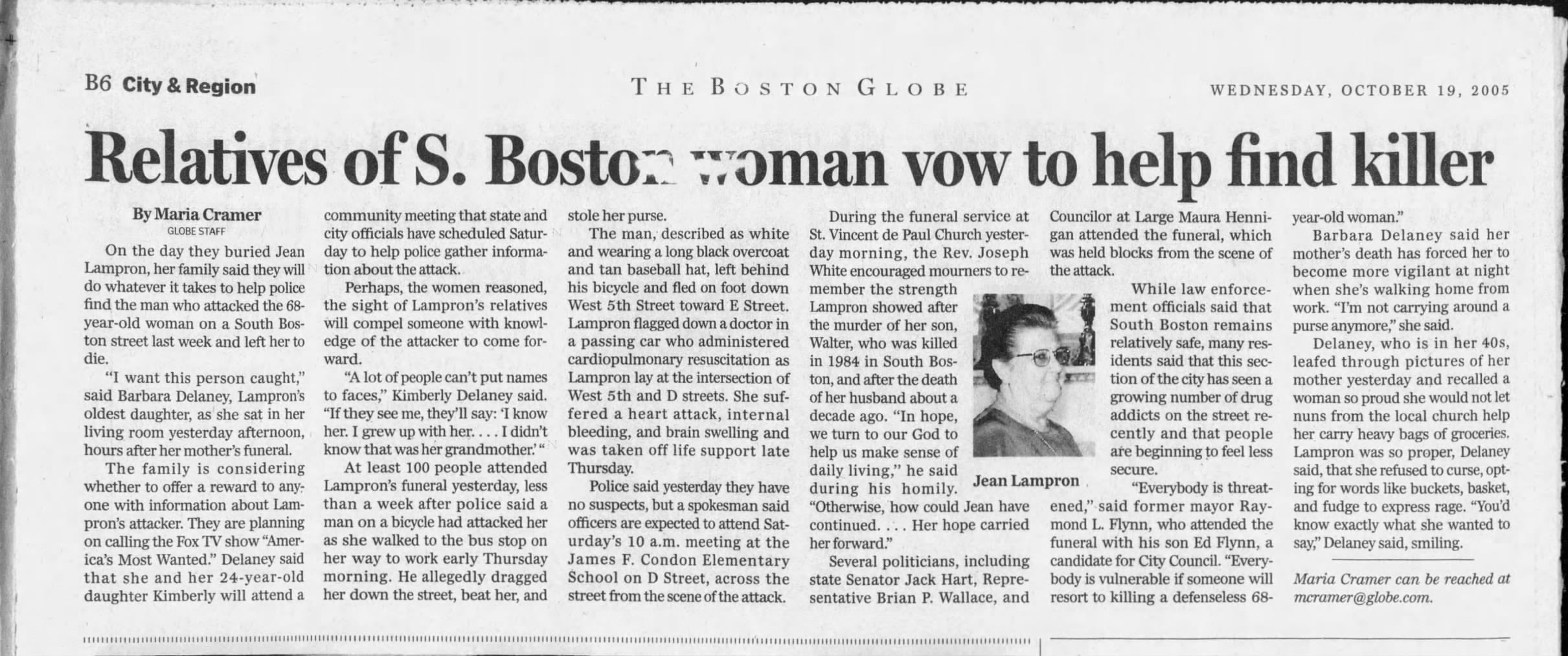 Tragically, this was not Lampron’s first experience with violence. Twenty-one years earlier, her son, Walter, was killed in South Boston, just blocks from where she was mugged.