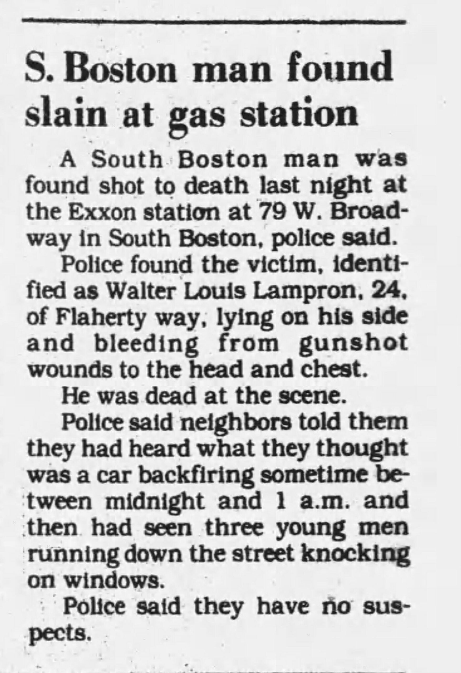 This news brief appeared in the Globe on Dec. 3, 1984, after 24-year-old Walter L. Lampron was found shot to death at a gas station in South Boston. – Boston Globe Archive