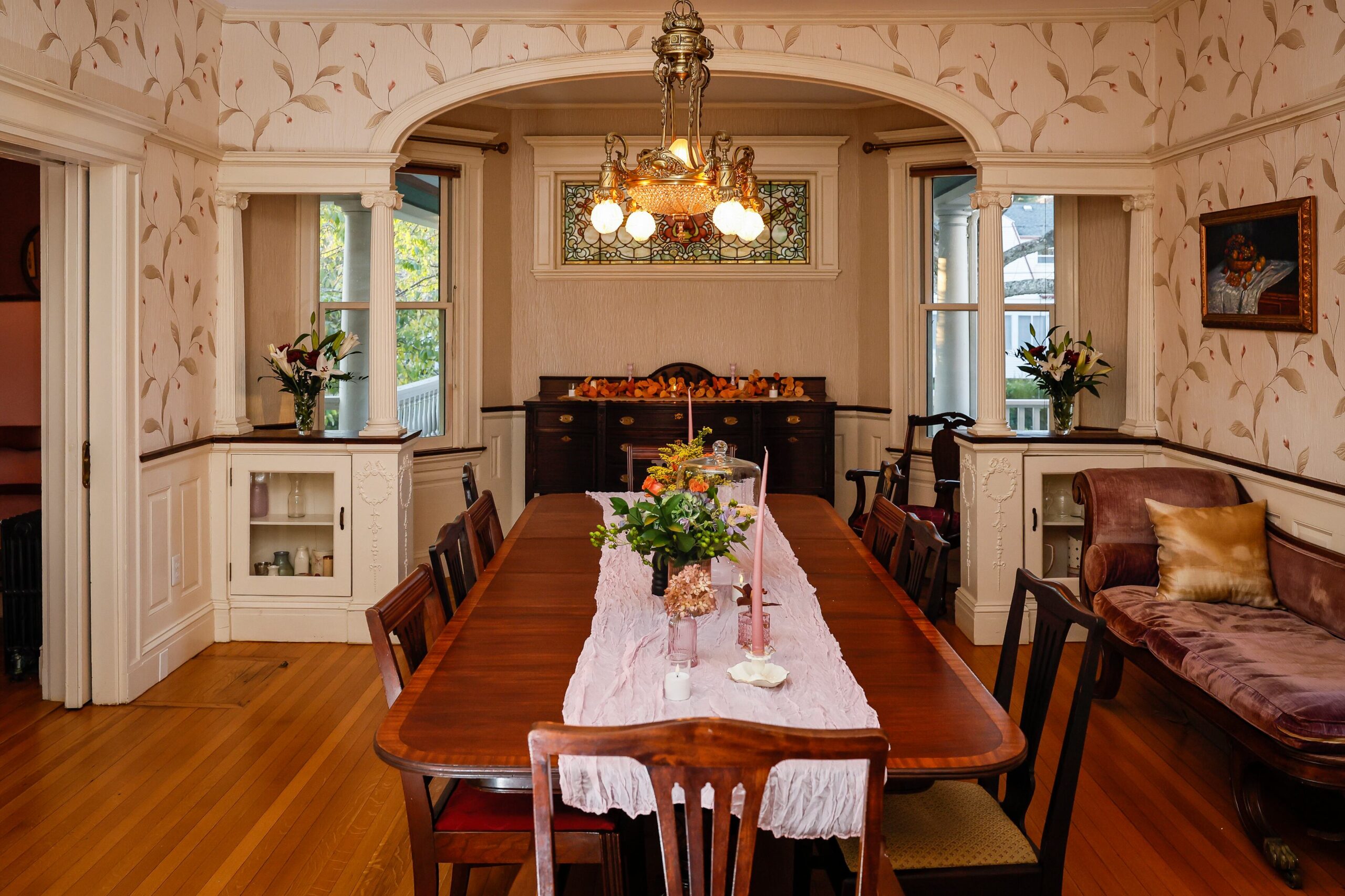 The formal dining room of Civry Vaughan’s home, built in 1900, features original woodwork, built-in cabinetry, and a stained glass window. – Erin Clark/Globe Staff
