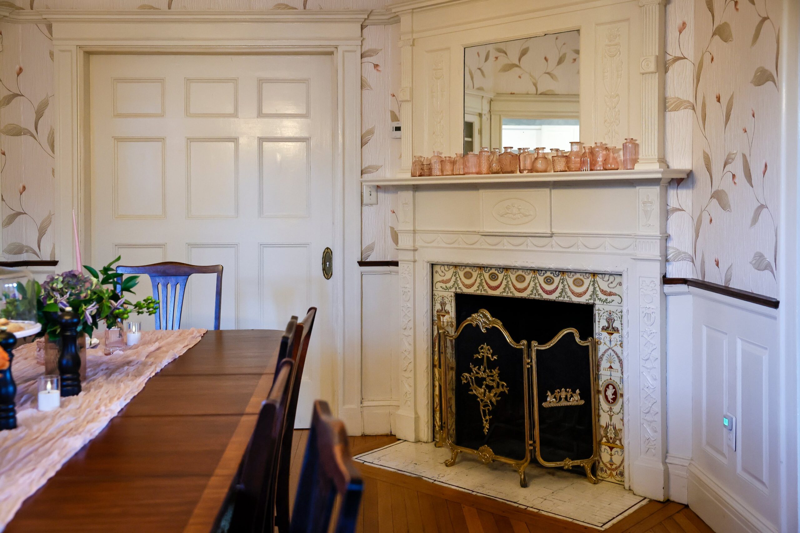 The dining room fireplace in Civry Vaughan’s 1900 home features ornate woodwork, decorative tile, and a built-in mirror framed by pink glass vases. – Erin Clark/Globe Staff