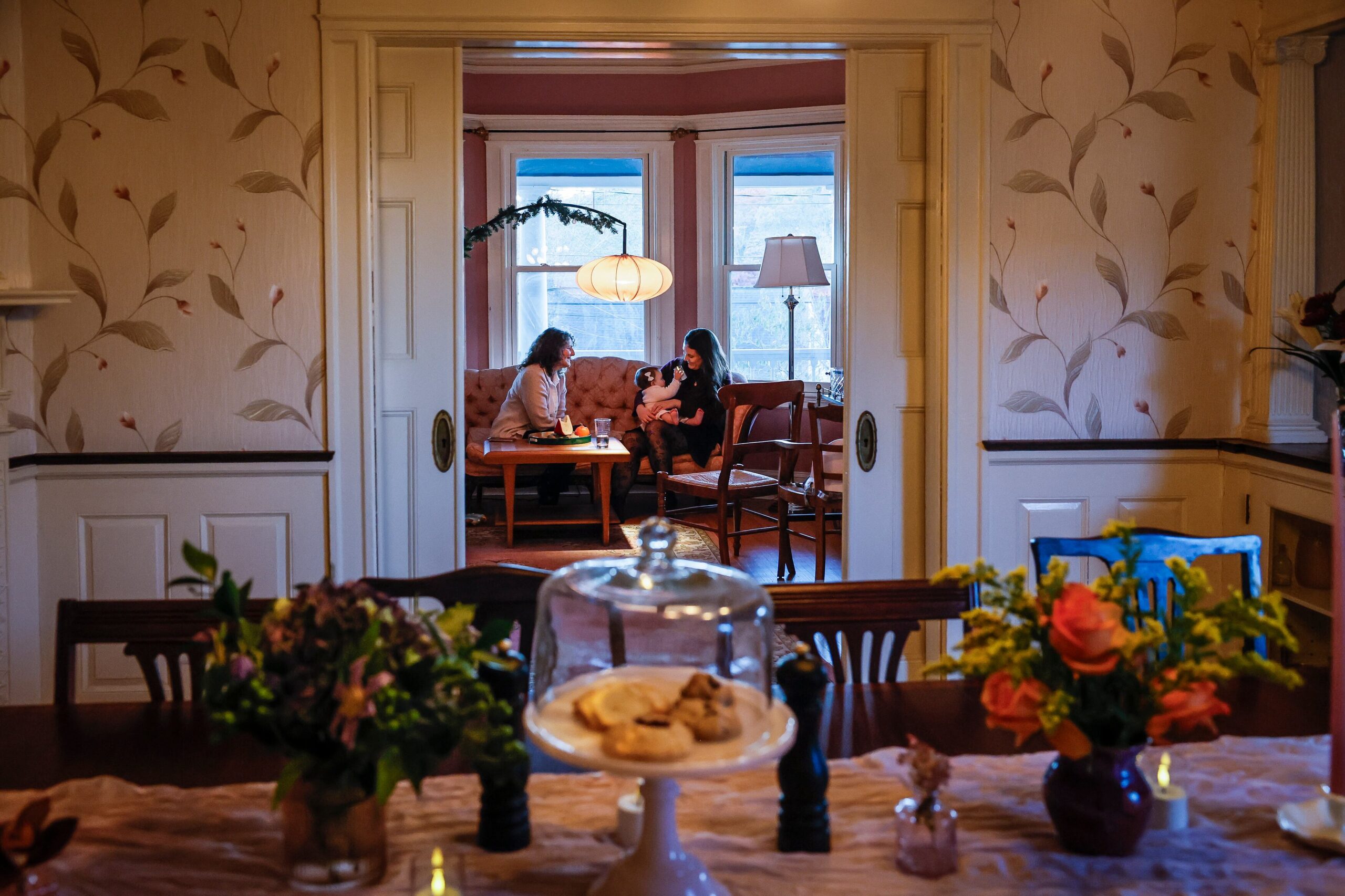 Civry Vaughan, center, with her 9-month-old daughter, Artemis, and Vaughan’s parents, Bob Melvin and Julie Rochlin, in Vaughan’s Roslindale home on Nov. 4, 2025. Vaughan and her husband, who purchased the 1900 house in September, plan to celebrate their first Thanksgiving here and use the formal dining room for family dinners year-round. Erin Clark/Globe Staff