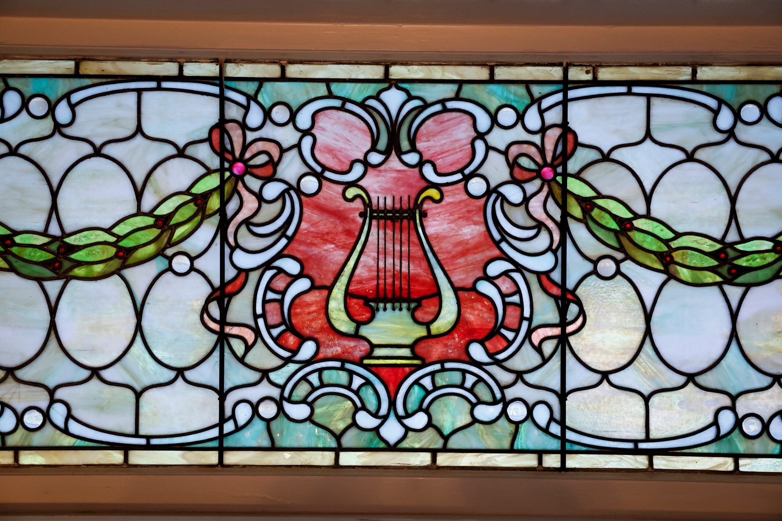 A stained glass window depicting a lyre adds a decorative focal point to the dining room of Civry Vaughan’s home, built in 1900. – Erin Clark/Globe Staff