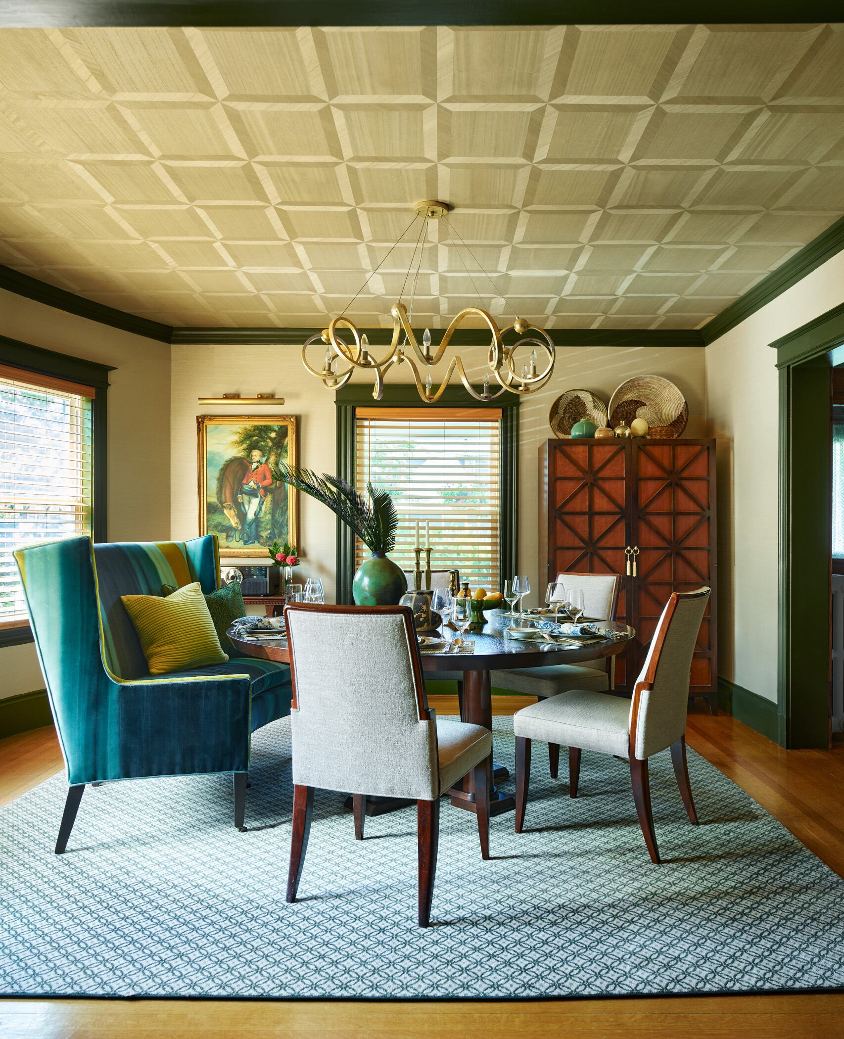 Austin swapped the living room and dining room in his own home and now enjoys meals and hosts guests in a 15-foot-by-15-foot dining room furnished with a neoclassical 72-inch round dining table, a wrought iron and Dutch gold leaf finished chandelier, a bespoke velvet settee, and a pair of mid-century modern-inspired burl cabinets.