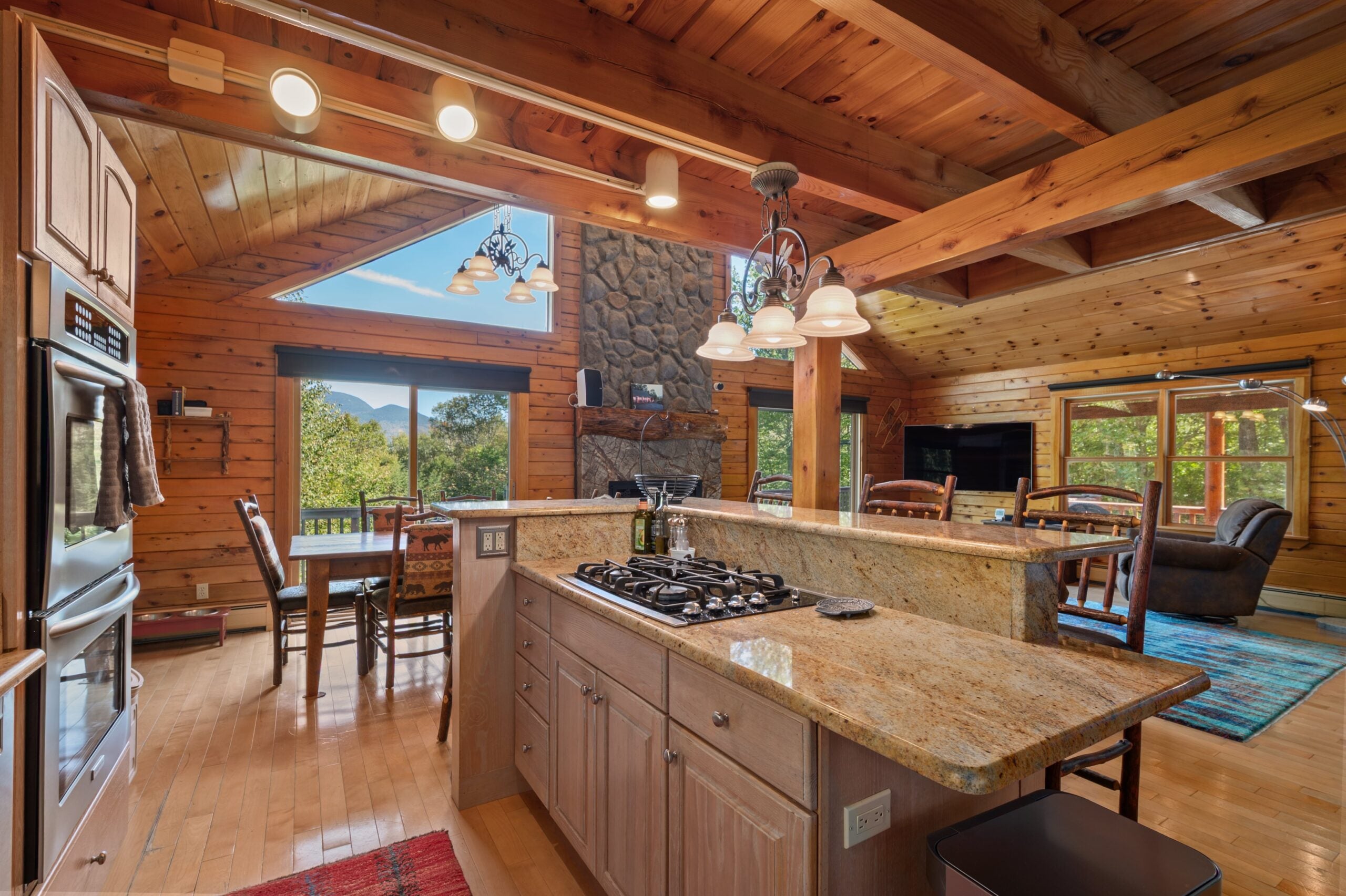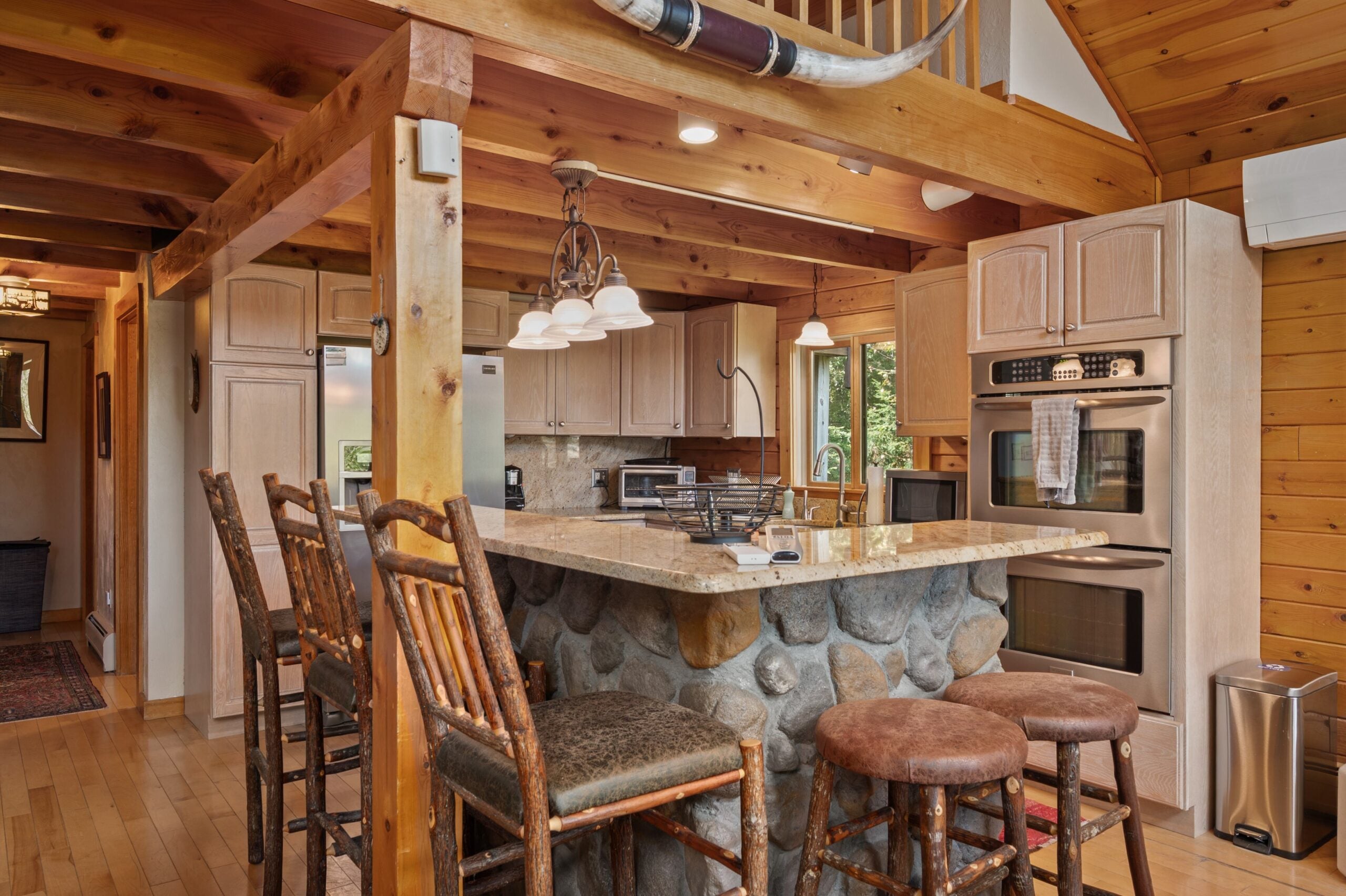 Stepping into the house is an immediate entry into a country atmosphere in the 397-square-foot living room. The towering cathedral ceiling is clad in tongue-and-groove cedar, while the floors are hardwood. Directly to the right is an interior rock-faced gas fireplace that reaches the ceiling.