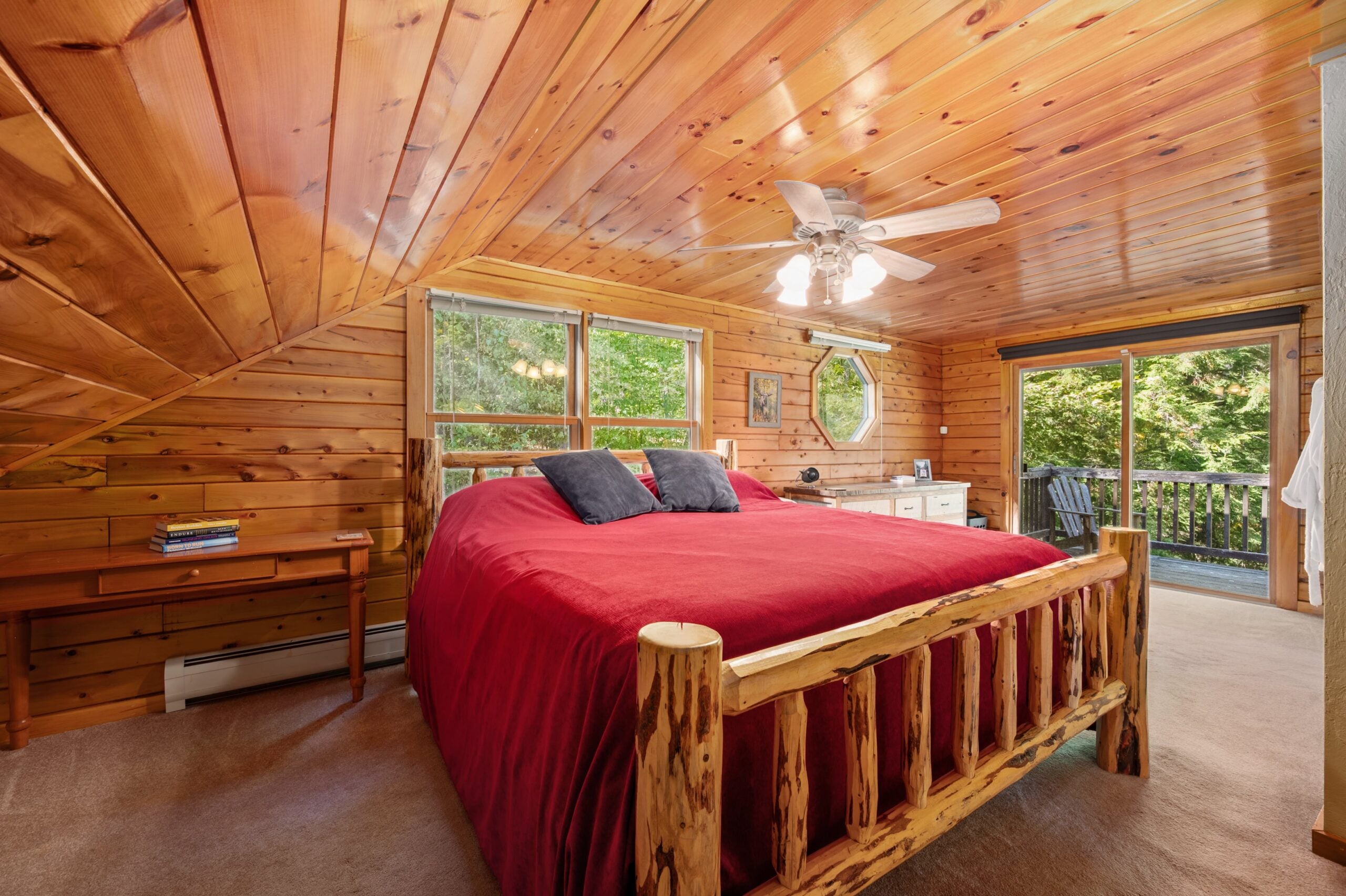 The bedroom lies behind a privacy-assuring door. It has an angled ceiling of cedar planks along with three walls made of the same material. There are two knee wall doors to access attic storage. The sunlight is copious due to a pair of double-hung windows behind the bed itself and from an octagonal window a bit away. But the top light source is the plate glass slider to the private deck with mountain views.