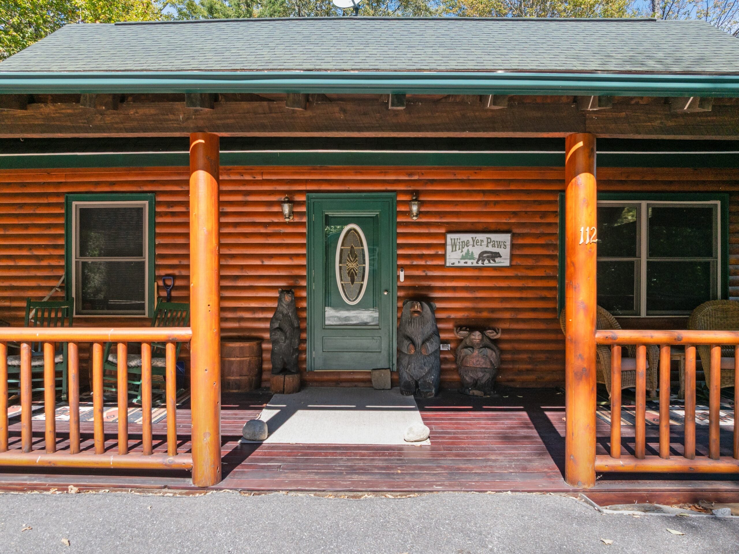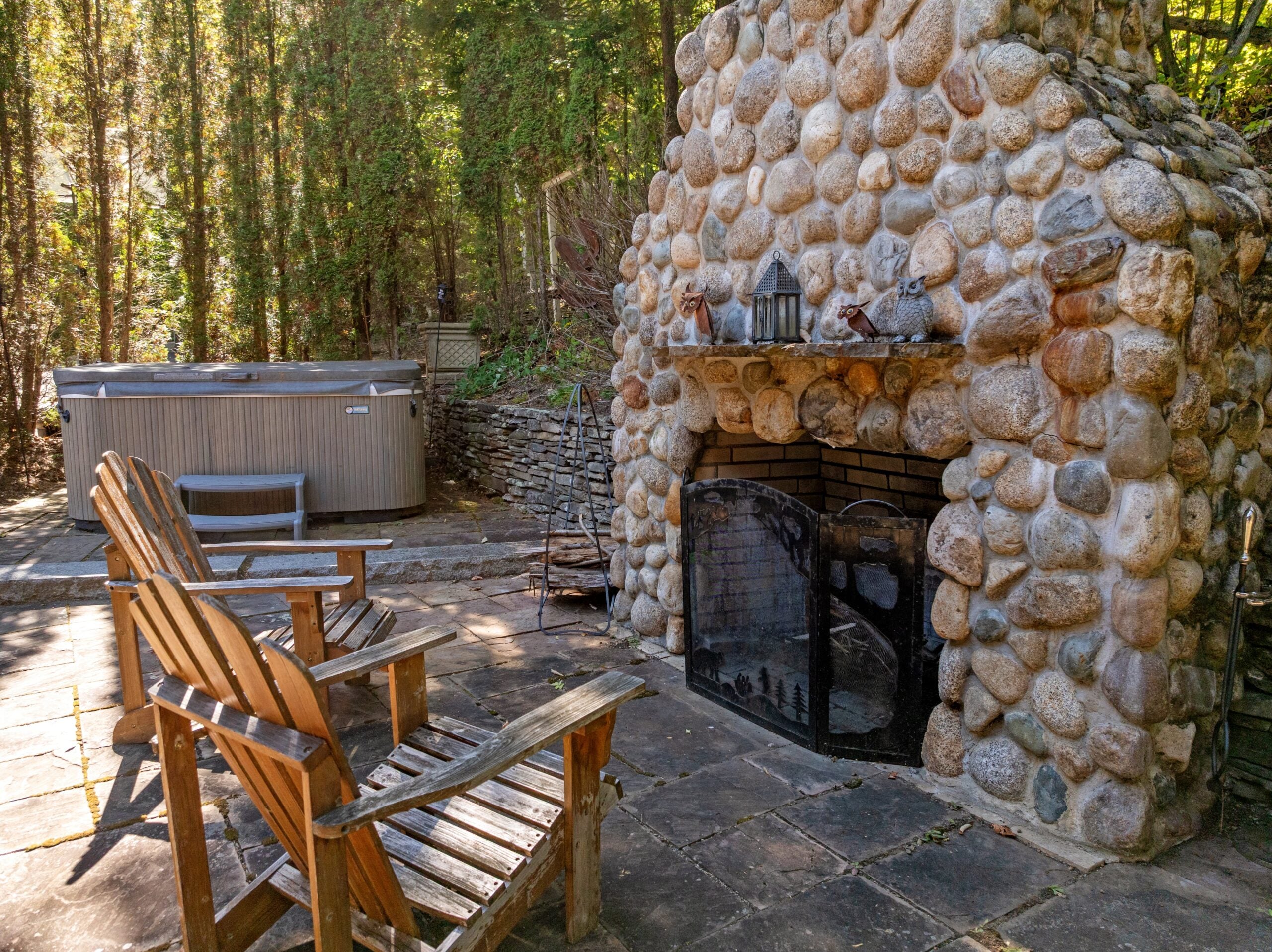 The home is surrounded by trees and reached by a paved driveway that ends in a flat area directly in front of the ranch-style front porch supported by thick wooden columns. On this flat space is also a windowed utilitarian storage shed. A large rock-faced fireplace is flanked by chairs resting atop a stone slab patio. Nearby is a large, functioning hot tub.