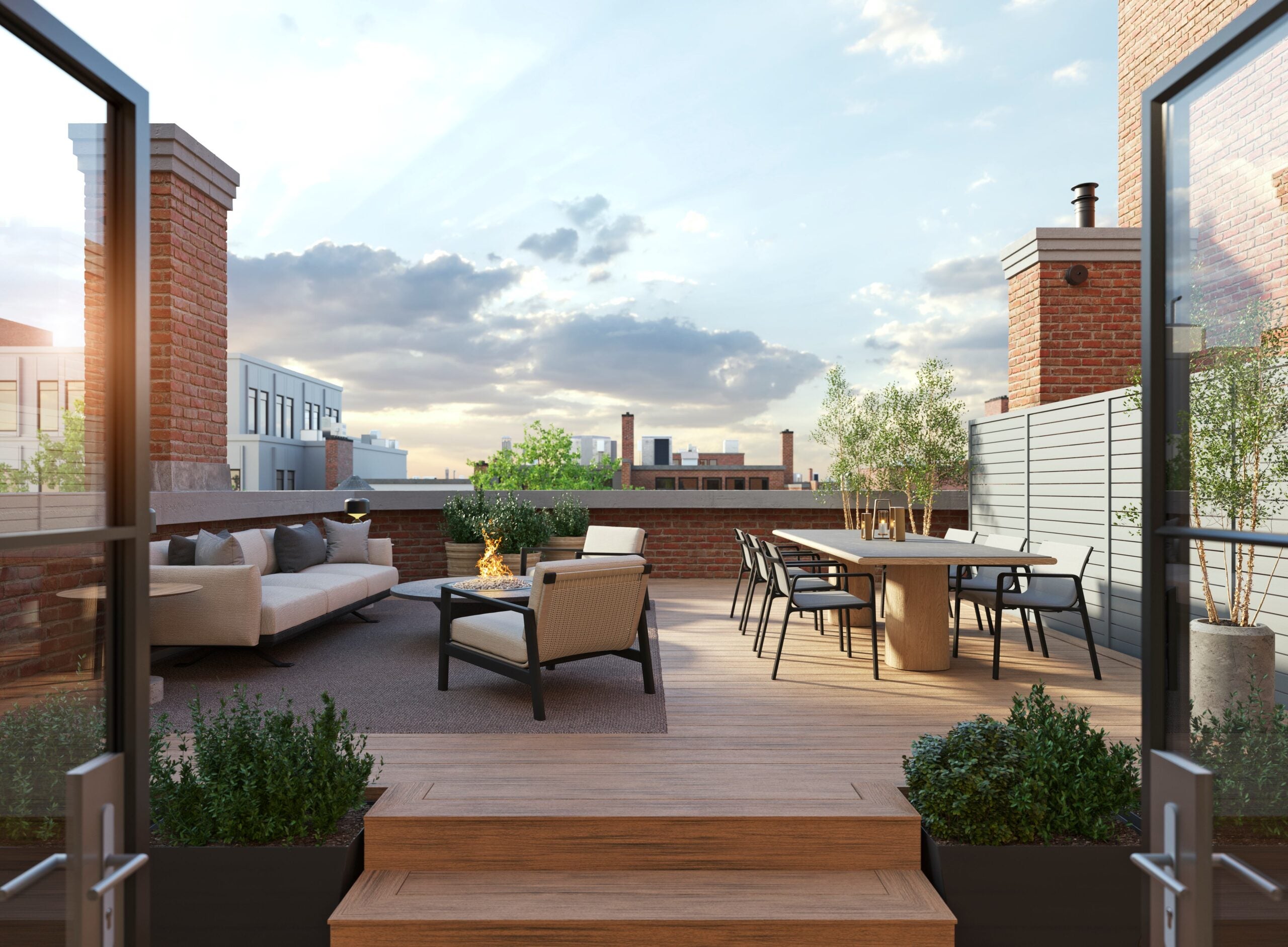Mooreland House, a new development of condominiums designed by Boston architecture and interiors firm Hacin, is slated for completion this spring. In the duplex penthouse, a wall of windows featuring French doors that lead to a large terrace lend Manhattan-loft vibes to the expansive living space. Three bedrooms overlook the tree-lined mall while the primary suite is on the floor above, along with a family room, mezzanine study, and a roof deck in the treetops.